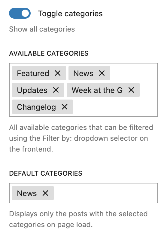 - Toggle between using all categories or a custom set of categories for both the available categories in the filter by dropdown and the default categories used when the news filter first loads.